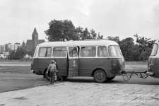 Czarno-biała fotografia przedstawia dwójkę dzieci wysiadających z przyczepy autobusu Jelcz 043 na przystanku w Lubinie.
